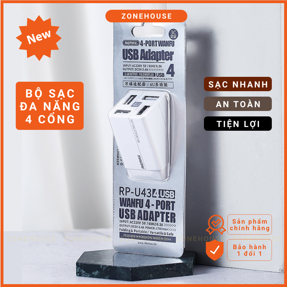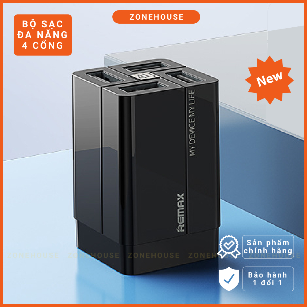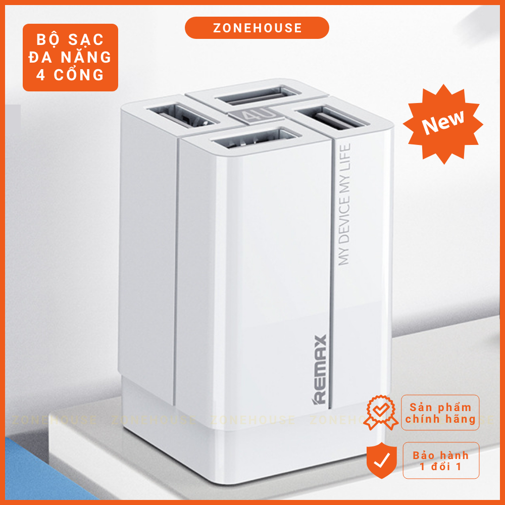Củ Sạc Nhanh 4 Cổng REMAX - ZoneHouse, Cục Sạc Điện Thoại Thông Minh, Chân Gập Tiện Dụng, Sạc Đa